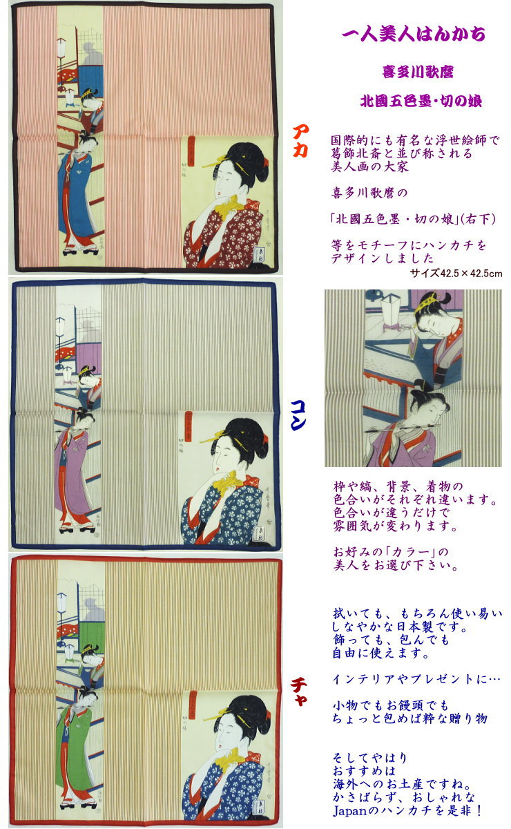 浮世絵ハンカチ 喜多川歌麿の美人画の浮世絵はんかち! 国際的にも有名な浮世絵師で葛飾北斎と並び称される美人画の大家、喜多川歌麿の「北國五色墨・切の娘」(右下)等をモチーフにハンカチをデザインしました。